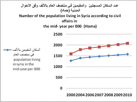 | عدد السكان المقيمين في منتصف العام بالألف | 1276 | 1396 | 1441 | 1474 | 1508 | 1541 | 1575 | Number of population living in syria in the mid-year per 000 | |||