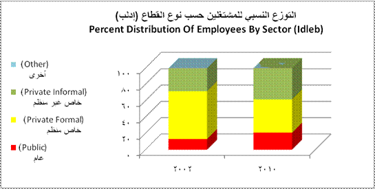 | التوزع النسبي للمشتغلين حسب القطاع والجنس (%) | 2002 | 2010 | Percent Distribution Of Employees By Sector And Sex (%) | |||||