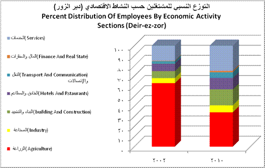 | التوزع النسبي للمشتغلين حسب النشاط الاقتصادي والجنس (%) | 2002 | 2010 | Percent Distribution Of Employees By Economic Activity Sections And Sex (%) | |||||