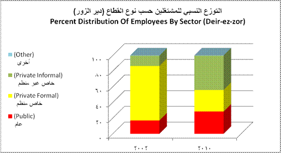 | التوزع النسبي للمشتغلين حسب القطاع والجنس (%) | 2002 | 2010 | Percent Distribution Of Employees By Sector And Sex (%) | |||||