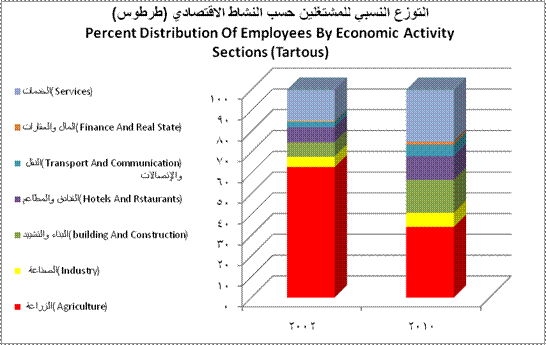 | التوزع النسبي للمشتغلين حسب النشاط الاقتصادي والجنس (%) | 2002 | 2010 | Percent Distribution Of Employees By Economic Activity Sections And Sex (%) | |||||