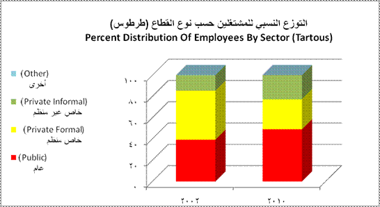 | التوزع النسبي للمشتغلين حسب القطاع والجنس (%) | 2002 | 2010 | Percent Distribution Of Employees By Sector And Sex (%) | |||||