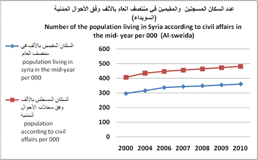 | عدد السكان السوريين المسجلين في الأحوال المدنية في منتصف العام بالألف | 407 | 436 | 447 | 455.5 | 464.5 | 473 | 481 | Number of the Syrian population according to civil affairs in the in the mid-year per 000 | |||