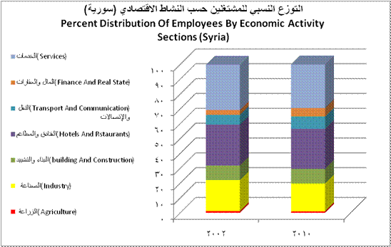 | التوزع النسبي للمشتغلين حسب النشاط الاقتصادي والجنس (%) | 2002 | 2010 | Percent Distribution Of Employees By Economic Activity Sections And Sex (%) | |||||