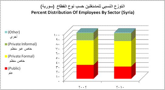 | التوزع النسبي للمشتغلين حسب القطاع والجنس (%) | 2002 | 2010 | Percent Distribution Of Employees By Sector And Sex (%) | |||||